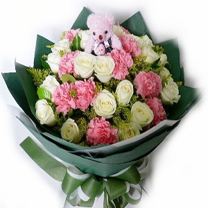 11 pink carnations, 11 white roses, match greenery, a lovely little bear, green and white crepe paper to wrap, same color bowknot.